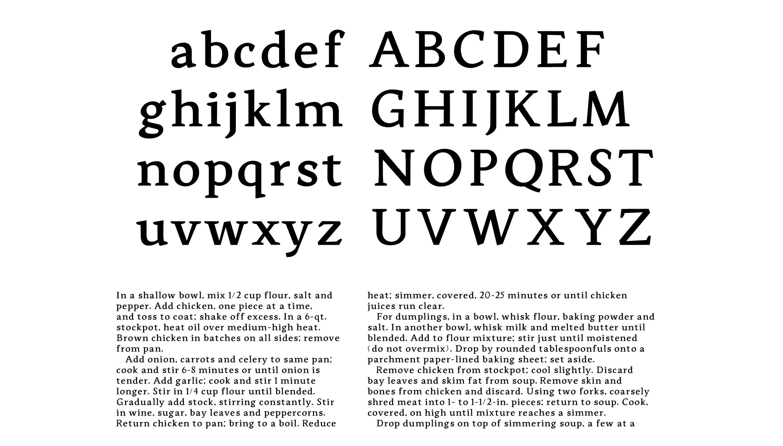 Designed during my time at Type@Cooper, I was imspired by cookbooks, and created a text typeface optimized for cookbookuse, witha serif that rises like dough giving it a unique approachable character